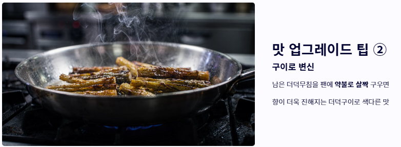- 구이로 변신: 무친 더덕이 남았다면 팬에 약불로 살짝 구워보세요. 향이 더욱 진해지는 더덕구이가 되어 색다른 맛을 느낄 수 있습니다.
