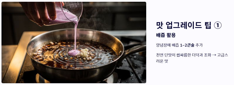 - 배즙 활용: 양념장에 배즙을 1~2큰술 넣으면 천연의 단맛이 더덕의 쌉싸름한 맛과 조화를 이루어 훨씬 고급스러운 더덕무침 만드는법이 됩니다.
