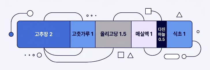 고추장 2, 고춧가루 1, 올리고당 1.5, 매실액 1, 다진 마늘 0.5, 식초 1의 비율로 양념장을 만듭니다. 매실액은 더덕의 풍미를 살리고 잡내를 잡아주는 더덕무침 만드는법의 숨은 공신입니다.