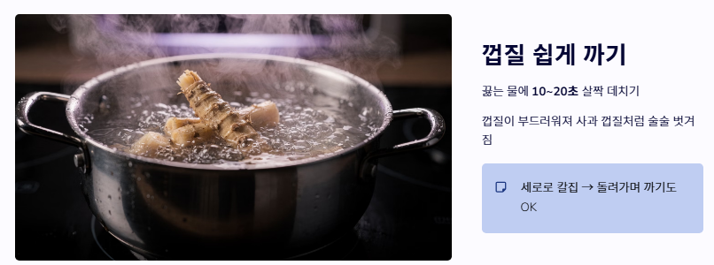 - 껍질 쉽게 까기: 더덕을 깨끗이 씻은 뒤 끓는 물에 10~20초 정도 살짝 데쳐보세요. 껍질이 부드러워져 칼집을 내면 사과 껍질처럼 술술 벗겨집니다. 혹은 겉면에 세로로 칼집을 내고 돌려가며 까는 것이 더덕무침 만드는법의 기본입니다.