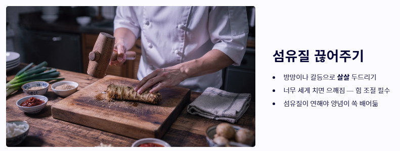 - 방망이로 적당히 두드려 섬유질을 연하게 만드는 것이 식감의 핵심입니다.