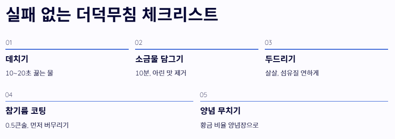 오늘 살펴본 더덕무침 만드는법의 핵심 내용을 정리합니다.