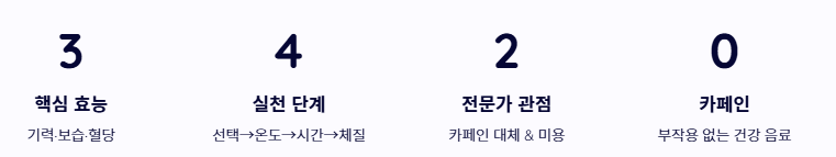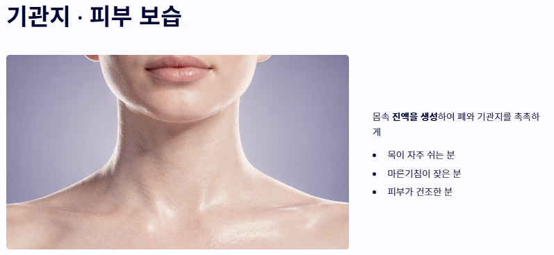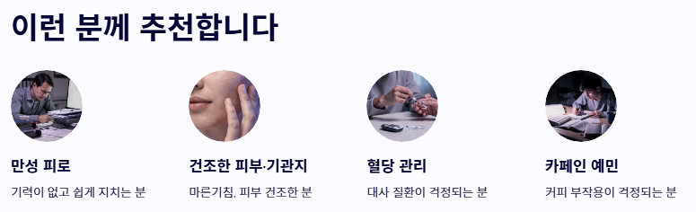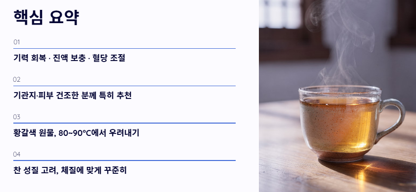- 커피 대신 마시기 좋으며, 특히 기관지가 건조하거나 피부 보습이 필요한 분들에게 추천합니다.