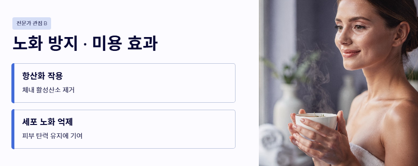 - 관점 B: '노화 방지와 미용' 측면의 강조 항산화 작용을 통해 체내 활성산소를 제거하는 점에 집중합니다. 세포의 노화를 늦추고 피부 탄력을 유지하는 데 기여하는 미용 식품으로서의 둥글레차 효과를 강조하며 여성들에게 적극 추천하는 입장입니다.