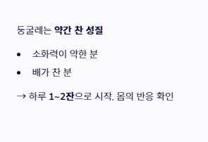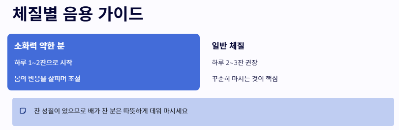 - 찬 성질이 있으므로 자신의 체질을 고려하여 적당량 꾸준히 마시는 것이 중요합니다.