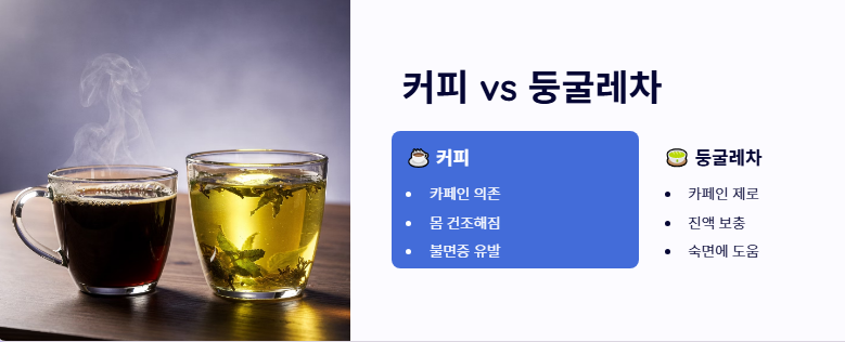 - 관점 A: '카페인 대체재'로서의 가치 커피의 부작용인 심장 두근거림이나 불면증이 없는 점에 주목합니다. 카페인에 예민한 직장인이나 수험생들에게 정신을 맑게 하면서도 몸을 보하는 최고의 대안 음료로서 둥글레차 효과를 높게 평가합니다.