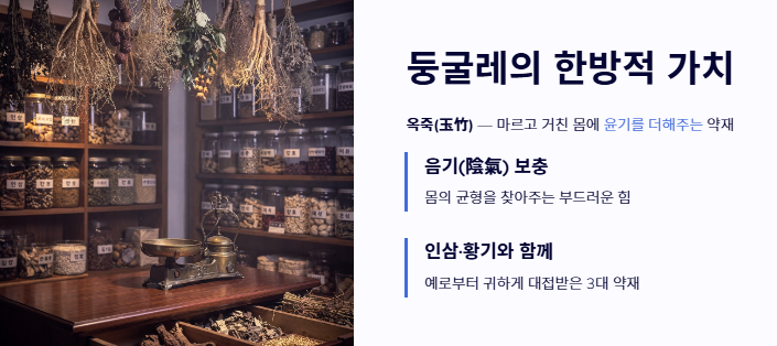 둥글레는 한방에서 '옥죽'이라 불리며, 마르고 거친 몸에 윤기를 더해주는 약재로 쓰입니다. 구체적인 둥글레차 효과는 크게 세 가지 영역으로 나뉩니다.