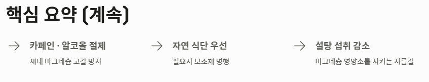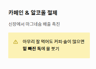 - 카페인과 알코올은 체내 마그네슘을 고갈시키므로 적절히 조절해야 합니다.