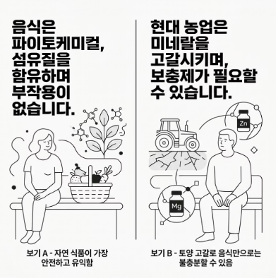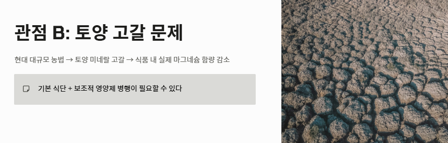 - 관점 B: "토양 고갈로 인해 식품만으로는 보충이 부족할 수 있다" 반면 일각에서는 현대의 대규모 농법으로 인해 토양 속 미네랄이 고갈되어 과거보다 마그네슘이 풍부한 음식의 실제 함량이 낮아졌다고 주장합니다. 이 관점에서는 기본 식단에 보조적인 영양제 섭취를 병행해야 현대인의 결핍을 막을 수 있다고 강조합니다.