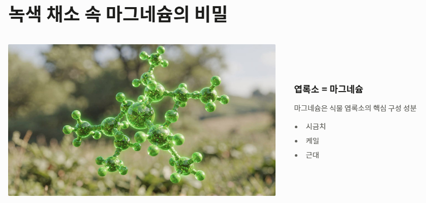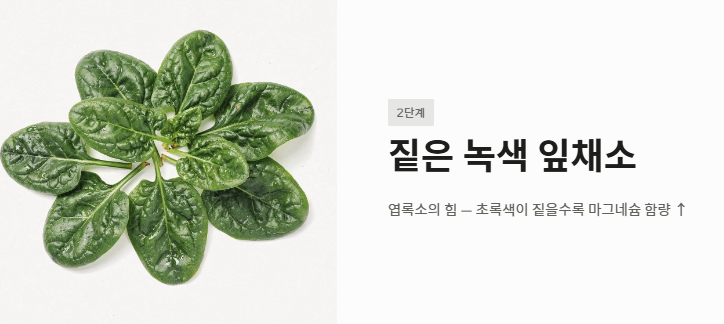 - 2단계: 짙은 녹색 잎채소 (엽록소의 힘): 시금치, 케일, 근대와 같은 채소들은 마그네슘이 풍부한 음식의 대명사입니다. 마그네슘은 식물의 엽록소 구성 성분이기 때문에 초록색이 짙을수록 그 함량이 높습니다.