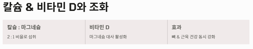 마그네슘은 칼슘의 흡수를 돕고 비타민 D 대사를 활성화합니다. 칼슘과 마그네슘의 비율을 2:1 정도로 맞춰 섭취하면 음식의 효능을 극대화하여 뼈와 근육 건강을 동시에 지킬 수 있습니다.