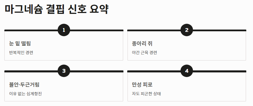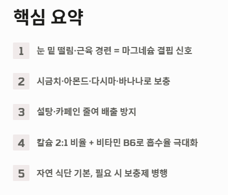 - 눈 밑 떨림과 근육 경련은 마그네슘 결핍의 대표적인 신호입니다.