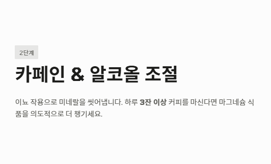 - 설탕과 카페인 섭취를 줄여야 체내 마그네슘 배출을 막을 수 있습니다.