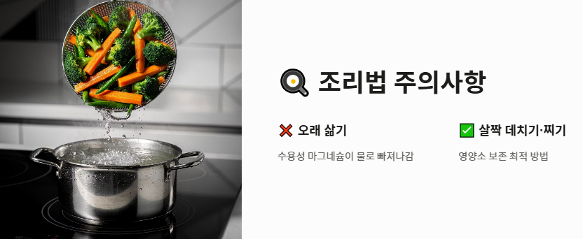- 조리법의 주의: 채소를 너무 오래 삶으면 수용성 미네랄인 마그네슘이 물로 빠져나갑니다. 살짝 데치거나 쪄서 먹는 것이 마그네슘이 풍부한 음식의 영양소를 보존하는 방법입니다.
