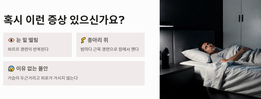 "자고 일어나도 개운하지 않으신가요?" 현대인의 필수 미네랄, 마그네슘이 필요한 신호눈밑이 파르르 떨리거나 밤마다 종아리에 쥐가 나서 잠을 설친 경험이 있으신가요? 혹은 특별한 이유 없이