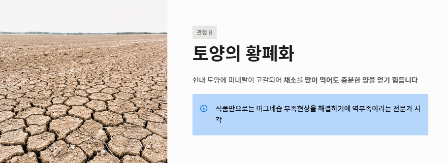 - 관점 B: "토양의 황폐화로 인한 식단의 한계를 인정해야 한다" 반면, 농업 환경 변화를 지적하는 전문가들은 현대 토양에 미네랄이 고갈되어 채소를 많이 먹어도 충분한 양을 얻기 힘들다고 봅니다. 이 관점에서는 적극적인 영양제 섭취를 통해 의도적으로 마그네슘 부족현상을 방어해야 한다고 강조합니다. 식품만으로는 마그네슘 부족현상을 해결하기에 역부족이라는 시각입니다.