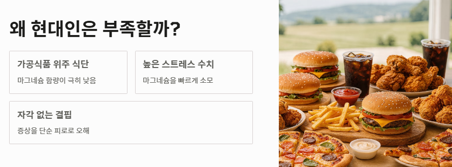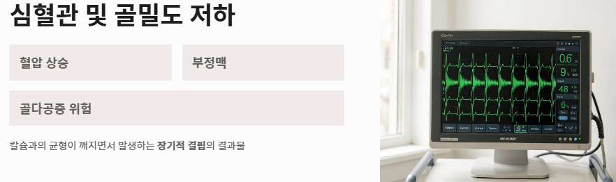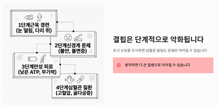 - 4단계: 심혈관 및 골밀도 저하: 장기적인 결핍은 혈압 상승, 부정맥, 골다공증 위험을 높입니다. 칼슘과의 균형이 깨지면서 발생하는 심각한 부족현상 결과물입니다.