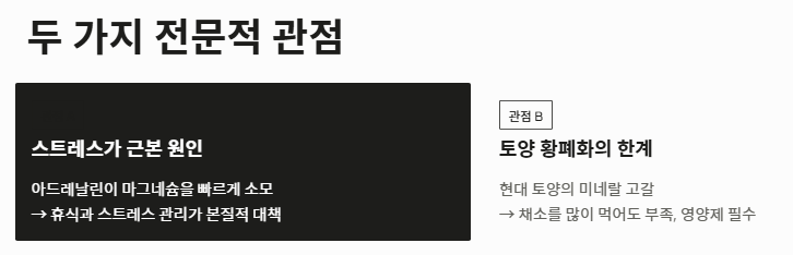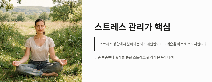 - 관점 A: "현대인의 스트레스가 마그네슘 부족의 근본 원인이다" 심리학 및 기능의학 전문가들은 스트레스 상황에서 분비되는 아드레날린이 마그네슘을 빠르게 소모시킨다는 점에 주목합니다. 따라서 단순 보충보다 휴식을 통해 스트레스를 관리하는 것이 마그네슘 부족을 막는 본질적인 대책이라고 주장합니다. 스트레스를 줄이지 않으면 마그네슘 부족한 증상은 반복될 수밖에 없습니다.