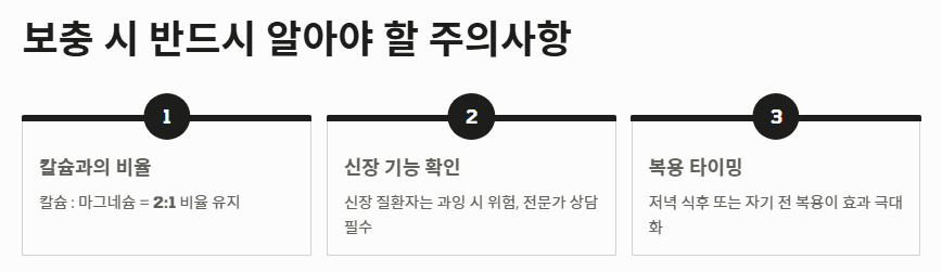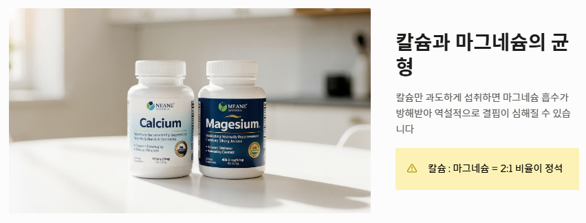 - 칼슘과의 비율: 칼슘만 과도하게 섭취하면 마그네슘 흡수가 방해받아 역설적으로 마그네슘 부족현상이 심해질 수 있습니다. 보통 칼슘과 마그네슘을 2:1 비율로 맞추는 것이 마그네슘 부족현상을 방지하는 정석입니다.