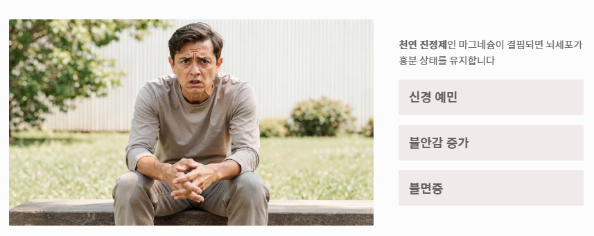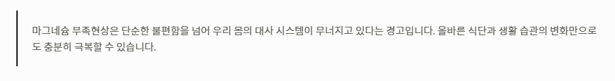 - 2단계: 신경계 및 심리적 변화: 신경이 예민해지고 불안감이 커지며 불면증에 시달릴 수 있습니다. '천연 진정제'인 마그네슘이 결핍되면 뇌세포가 흥분 상태를 유지하며 심한 부족현상을 유발하기 때문입니다.