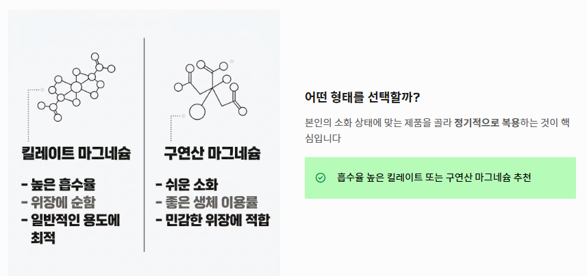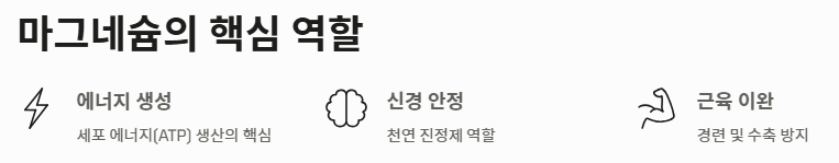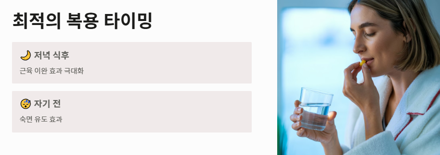 - 복용 타이밍: 근육 이완과 숙면을 원한다면 저녁 식후나 자기 전에 복용하는 것이 마그네슘 부족현상 완화 효과를 극대화하는 팁입니다.