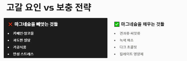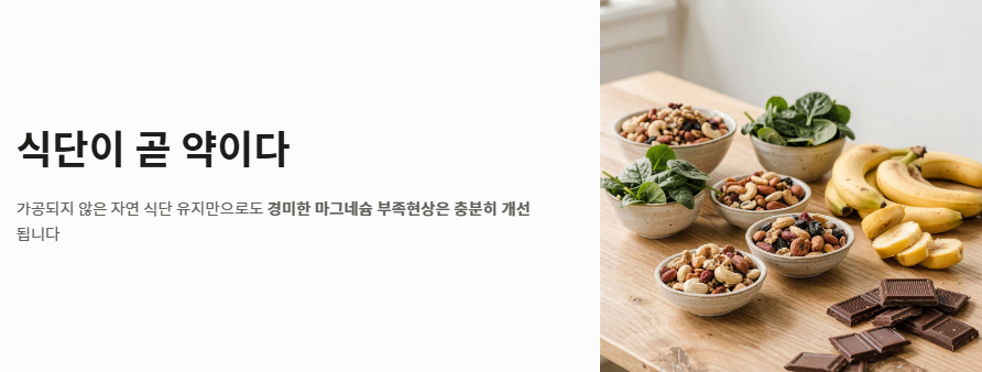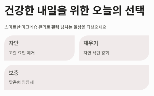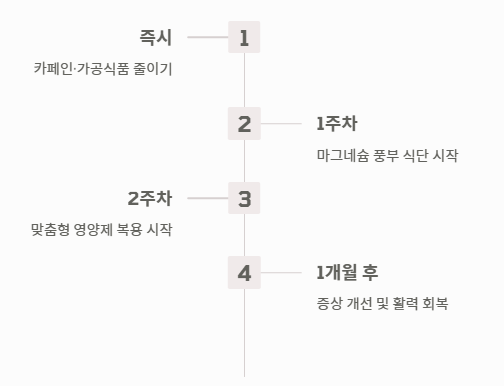 증상을 인지했다면 이제는 적극적으로 보충해야 할 때입니다. 일상에서 마그네슘을 극복하는 체계적인 방법입니다.