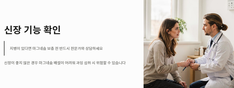 - 신장 기능 확인: 신장이 좋지 않은 분들은 마그네슘 배설이 어려워 과잉 시 위험할 수 있습니다. 지병이 있다면 마그네슘 부족현상 치료 전 반드시 전문가와 상담해야 합니다.