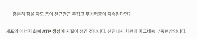 - 3단계: 만성 피로와 무기력증: 세포의 에너지 화폐인 ATP 생성에 차질이 생깁니다. 충분히 잠을 자도 몸이 천근만근 무겁고 무기력증이 지속된다면 이는 신진대사 차원의 마그네슘 부족현상으로 볼 수 있습니다.