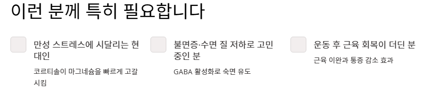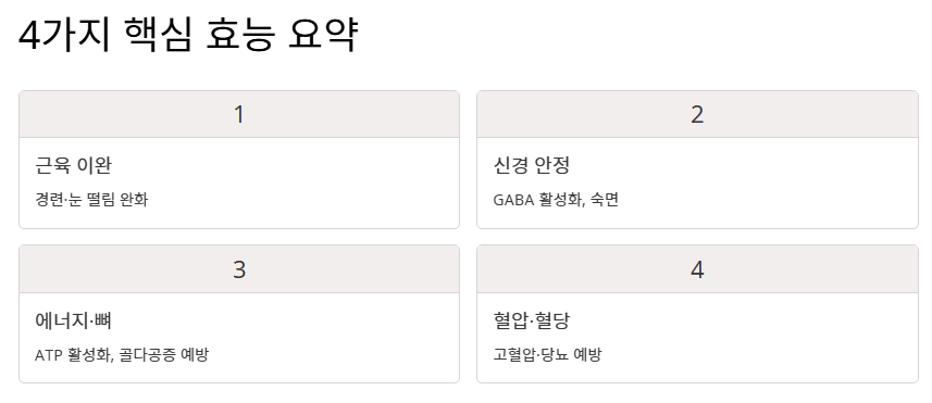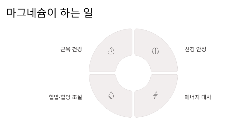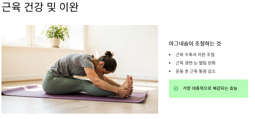 - 마그네슘은 근육 이완, 신경 안정, 에너지 생성에 탁월한 효능을 발휘합니다.