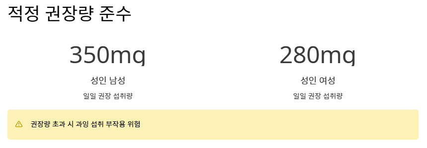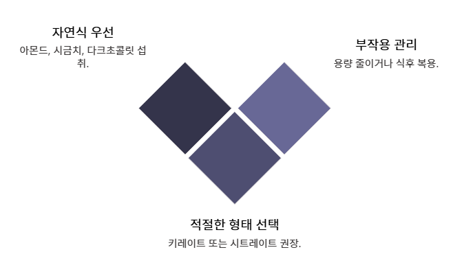 - 적정 권장량 준수: 성인 남성 350mg, 여성 280mg 내외의 권장량을 지켜야 마그네슘 효능 부작용 중 과잉 섭취로 인한 문제를 막을 수 있습니다.