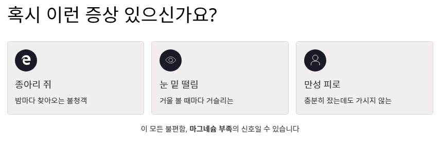 "밤마다 찾아오는 불청객인 종아리 쥐, 거울을 볼 때마다 거슬리는 눈 밑 떨림, 그리고 충분히 잤는데도 가시지 않는 만성 피로까지. 혹시 이 모든 불편함이 우리 몸속 300가지 이상의 화학 반응을 책임지는 '에너지 미네랄' 하나가 부족해서 생기는 신호라는 사실을 알고 계셨나요?"