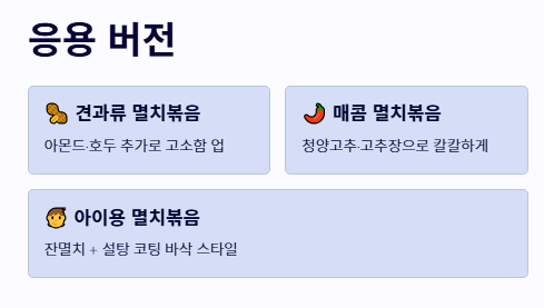 - 관점 B: '촉촉함'을 강조한 반찬 스타일 중멸치나 대멸치를 사용하며, 육수나 물을 한두 큰술 섞어 양념이 자작하게 배어들게 합니다. 고추장 양념을 가미하기도 하며, 밥과 함께 부드럽게 씹히는 멸치볶음 맛있게 만드는법을 지향하는 관점입니다.