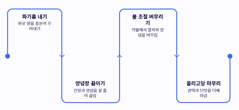 - 양념장은 미리 끓여서 사용하되, 멸치를 넣은 후에는 불을 줄여 타지 않게 합니다.