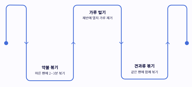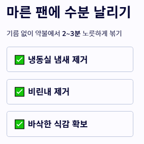 - 마른 팬에 먼저 볶아 수분과 비린내를 확실히 날려줍니다.
