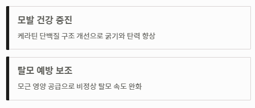 - 탈모 예방 보조: 모근에 영양을 공급하여 비정상적인 탈모 속도를 늦추는 데 도움을 줍니다.