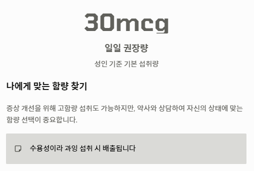 성인 기준 일일 권장 섭취량은 약 30mcg이지만, 증상 개선을 위해 고함량을 섭취하기도 합니다. 다만, 수용성이기에 많이 먹어도 배출되지만 처음부터 과하게 먹기보다는 자신의 상태에 맞는 함량을 약사와 상의하여 선택하는 것이 좋습니다.