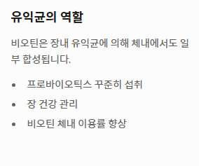 비오틴은 장내 유익균에 의해 체내에서도 일부 합성됩니다. 따라서 유산균(프로바이오틱스)을 꾸준히 섭취하여 장 건강을 관리하면 비오틴의 체내 이용률을 더욱 높일 수 있습니다.