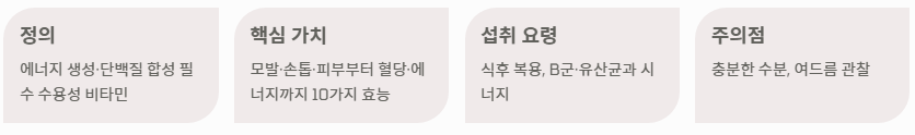 - 정의: 에너지 생성과 단백질 합성에 관여하는 필수 수용성 비타민.