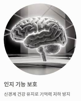 - 인지 기능 보호: 신경계 건강을 유지하여 기억력 저하 방지에 긍정적인 영향을 줍니다.
