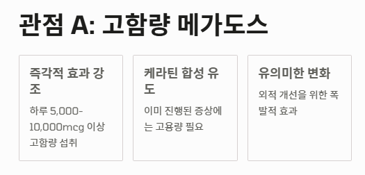 이 관점에서는 탈모나 손톱 갈라짐이 이미 진행된 경우, 일반 권장량으로는 부족하다고 봅니다. 하루 5,000mcg에서 10,000mcg 이상의 고함량을 섭취하여 체내 케라틴 합성을 폭발적으로 유도해야만 유의미한 외적 변화를 볼 수 있다는 입장입니다.