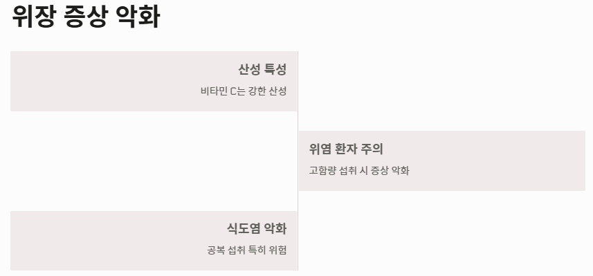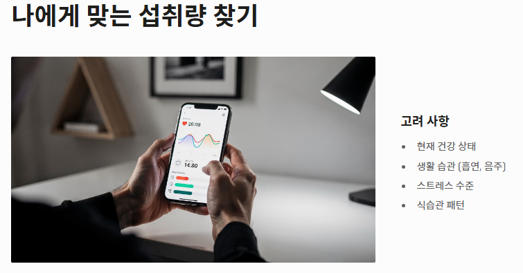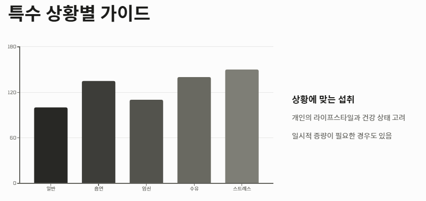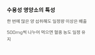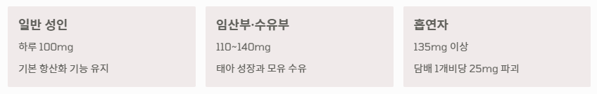 - 특수 상황: 흡연자, 임산부, 스트레스가 많은 현대인은 더 많은 양이 필요합니다.