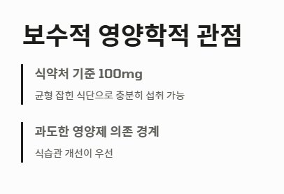 - 표준 수치: 일반 성인 기준 하루 100mg이 공식 권장량입니다.