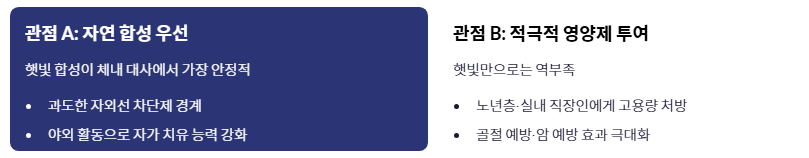- 관점 B: '적극적인 영양제 투여' 강조 피부암 위험과 현대인의 라이프스타일을 고려할 때 햇빛만으로는 역부족이라는 입장입니다. 특히 노년층이나 실내 직장인에게는 고용량 주사 요법이나 영양제 처방을 통해 즉각적으로 비타민d 부족증상을 차단하고 골절 예방 및 암 예방 효과를 극대화해야 한다는 시각입니다.