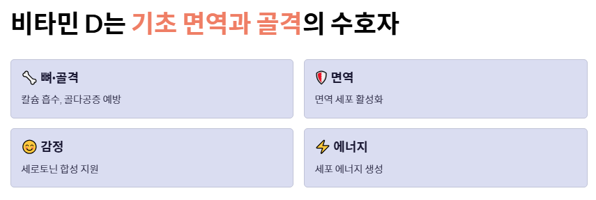 - 감정 기복과 우울감: 세로토닌 같은 행복 호르몬 합성에 관여하므로, 이유 없는 불안감이나 계절성 우울증 또한 흔한 비타민d 부족증상 중 하나로 꼽힙니다.