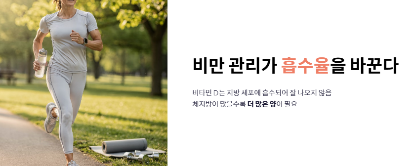 - 비만 관리: 비타민 D는 지방 세포에 흡수되어 잘 나오지 않는 성질이 있습니다. 체지방이 많을수록 더 많은 양이 필요하므로 체중 조절이 비타민d 부족증상 극복에 유리합니다.