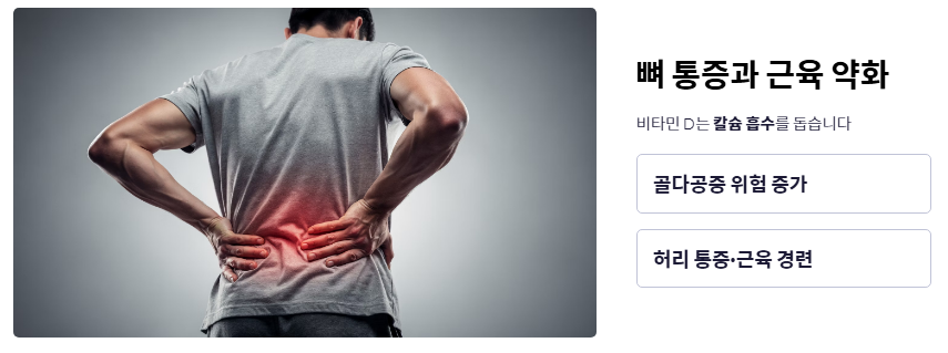 - 뼈의 통증과 근육 약화: 비타민 D는 칼슘 흡수를 돕습니다. 따라서 비타민d 부족증상이 심해지면 뼈가 약해져 골다공증 위험이 커지고, 원인 모를 허리 통증이나 근육 경련이 자주 발생합니다.