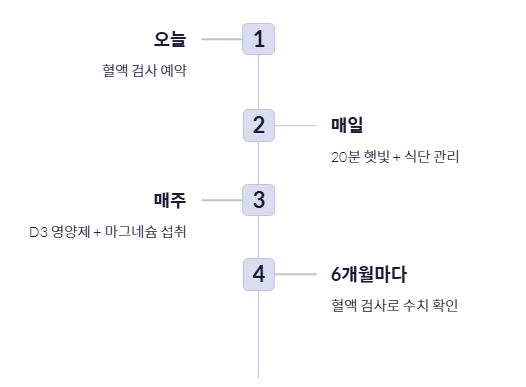 한 번 수치를 올렸다고 해서 방심해서는 안 됩니다. 6개월 주기로 검사를 진행하여 자신의 적정 유지 용량을 파악하고, 일상 속에서 비타민d 부족증상이 재발하지 않도록 관리하는 것이 중요합니다.