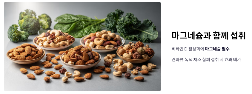 - 마그네슘과 함께 섭취: 비타민 D가 체내에서 활성화되려면 마그네슘이 필수적입니다. 견과류나 녹색 채소를 함께 드시면 비타민d 부족증상 완화 효과가 배가됩니다.
