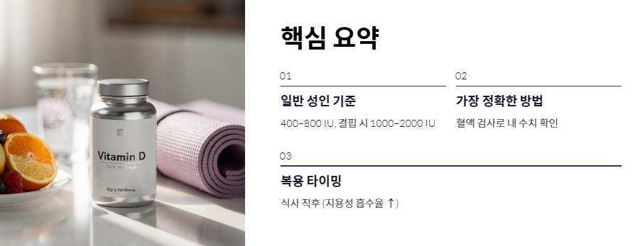 - 일반적인 성인 기준은 400~800IU이지만, 현대인의 결핍 상태를 고려하면 1000~2000IU가 권장되기도 합니다.