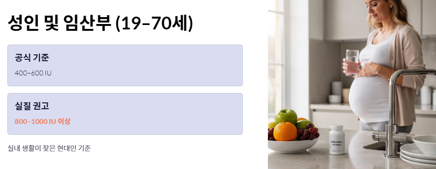 - 성인 및 임산부(19~70세): 한국 영양학회 기준으로는 400~600IU를 제시하지만, 실내 생활이 잦은 현대인에게는 800~1000IU 이상을 실질적인 하루 권장량으로 보는 견해가 많습니다.